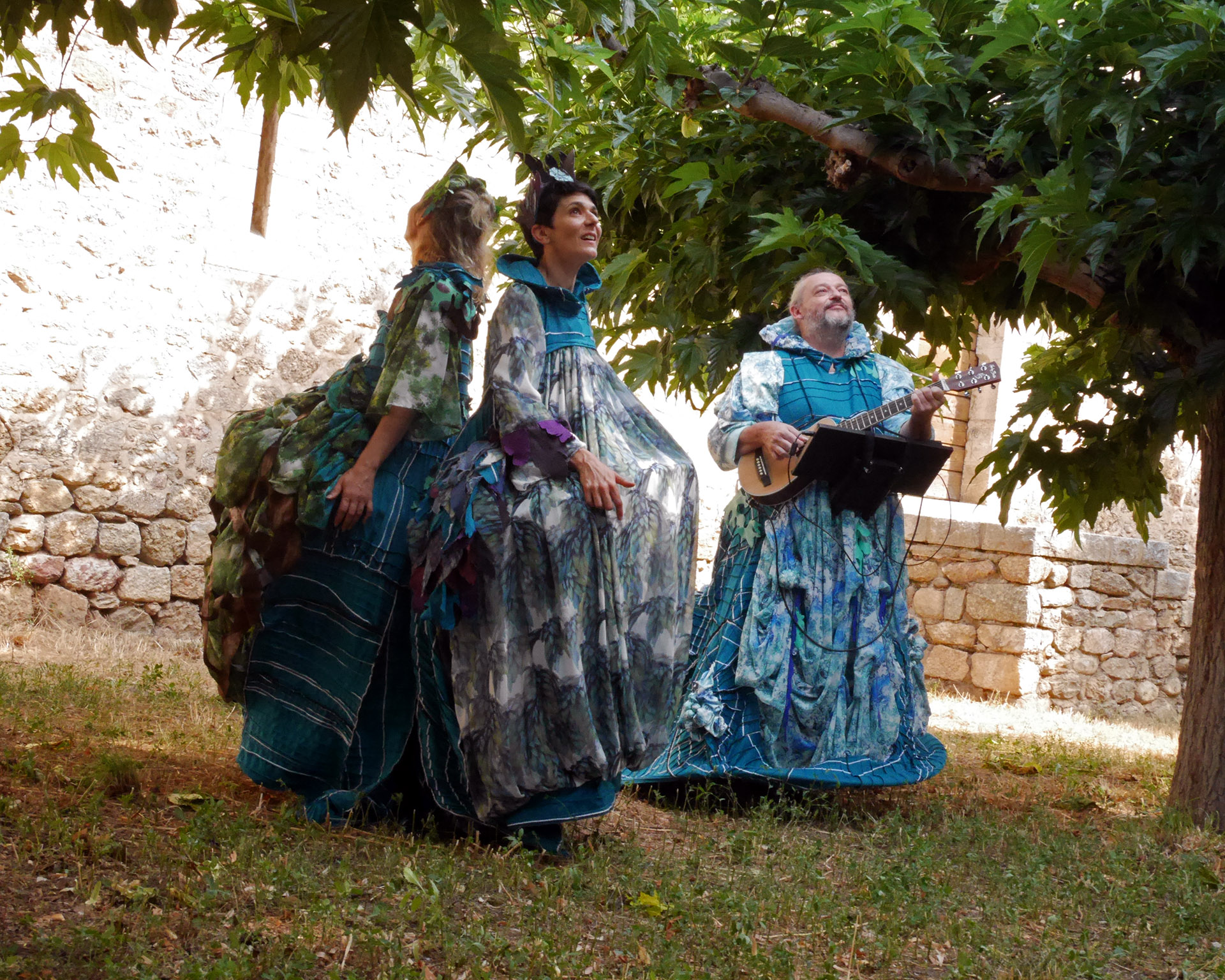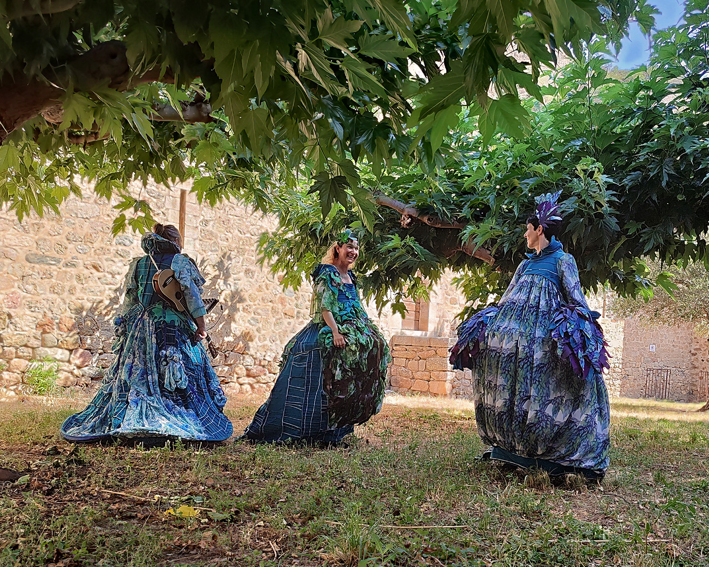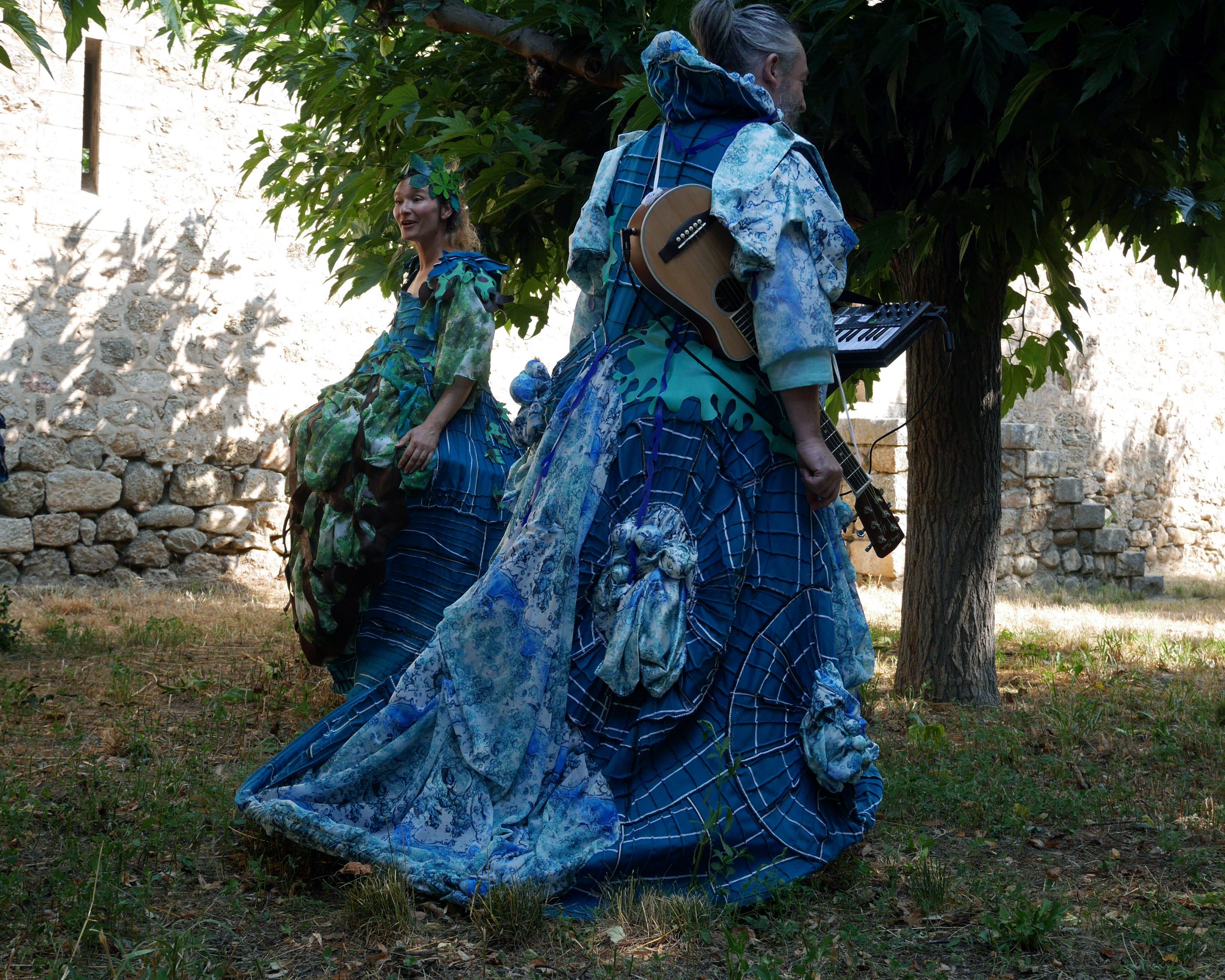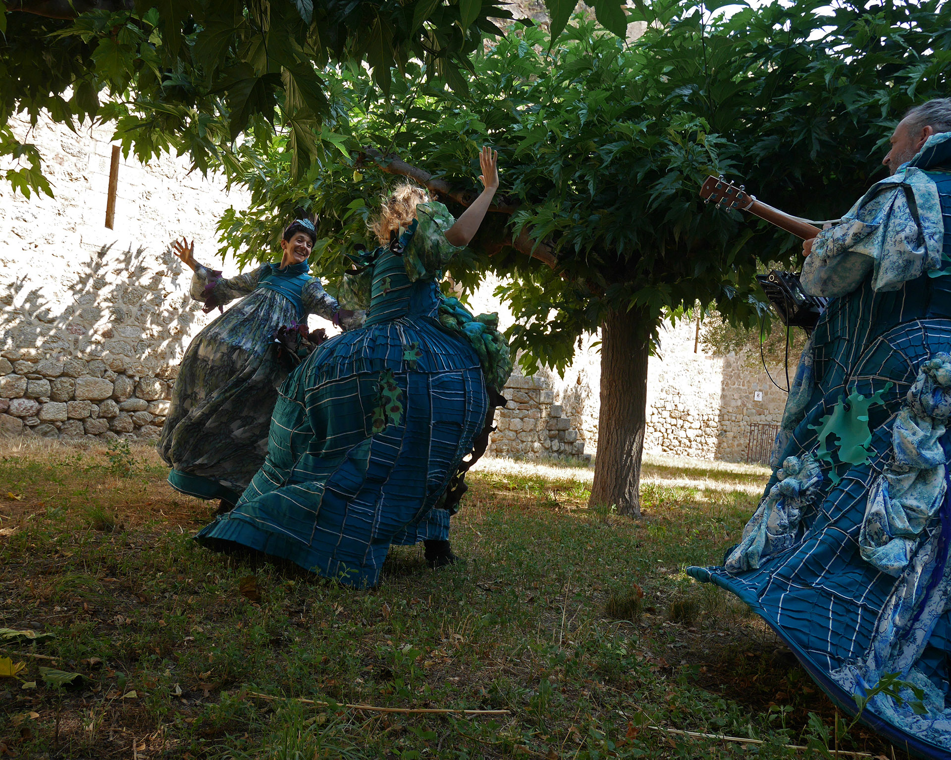 Le public comme les comédiens sont installés en circulaire, ils pénètrent dans l’espace de jeu et restent libre de leurs mouvements. Trois personnages, Ploume, Flotte et Racine sont vêtus de costumes qui nous servent de décor. Il et elles nous racontent l’eau, le vent, la nature… Nous traçons une suite d’évocations poétiques qui s’enclenchent par des clapotis sonores pour s’épanouir en petites symphonies musicales, corporelles et vocales. Le spectacle prend sa source dans la nature, nous suivons le cours d’eau pour aller à la rencontre du vivant.