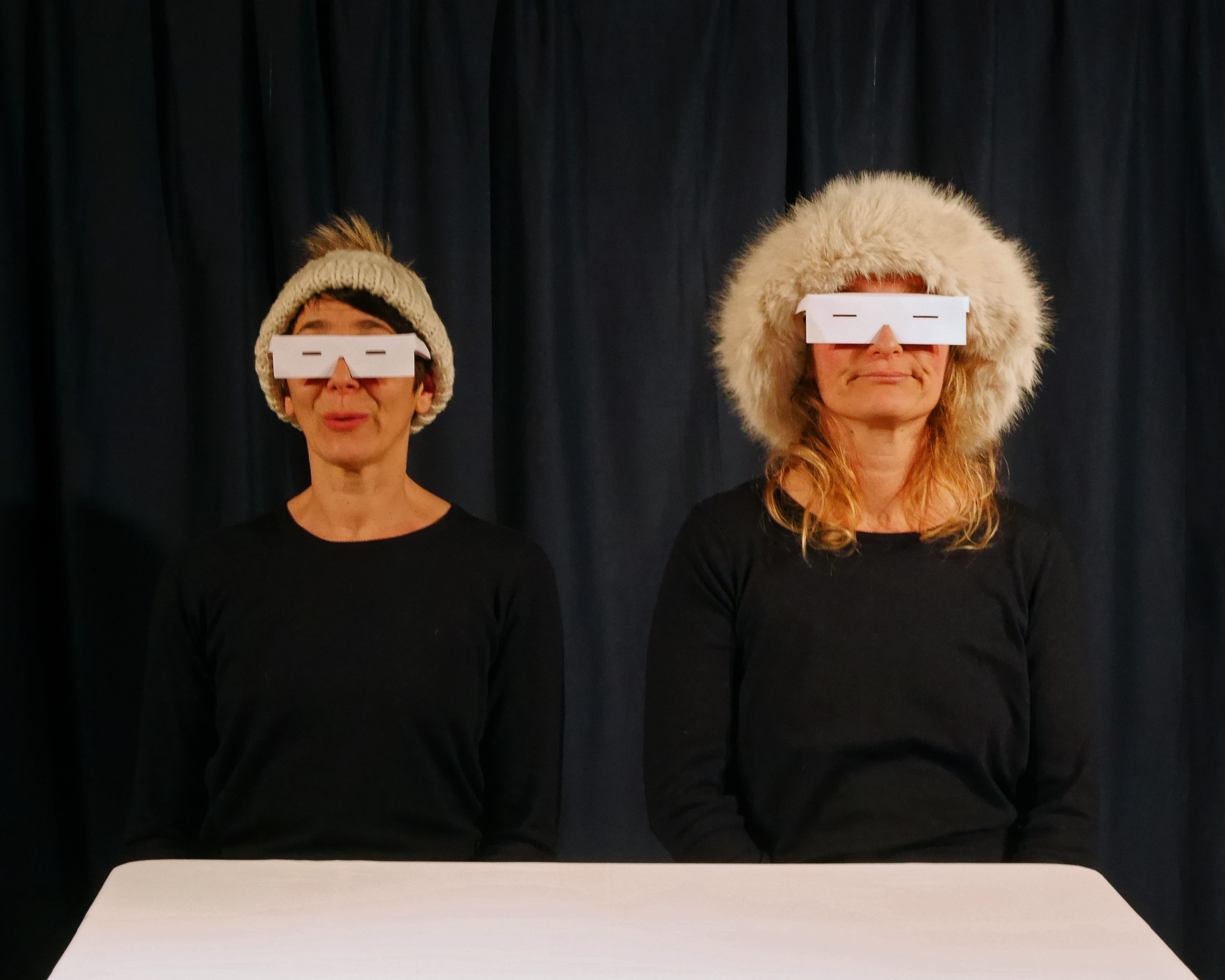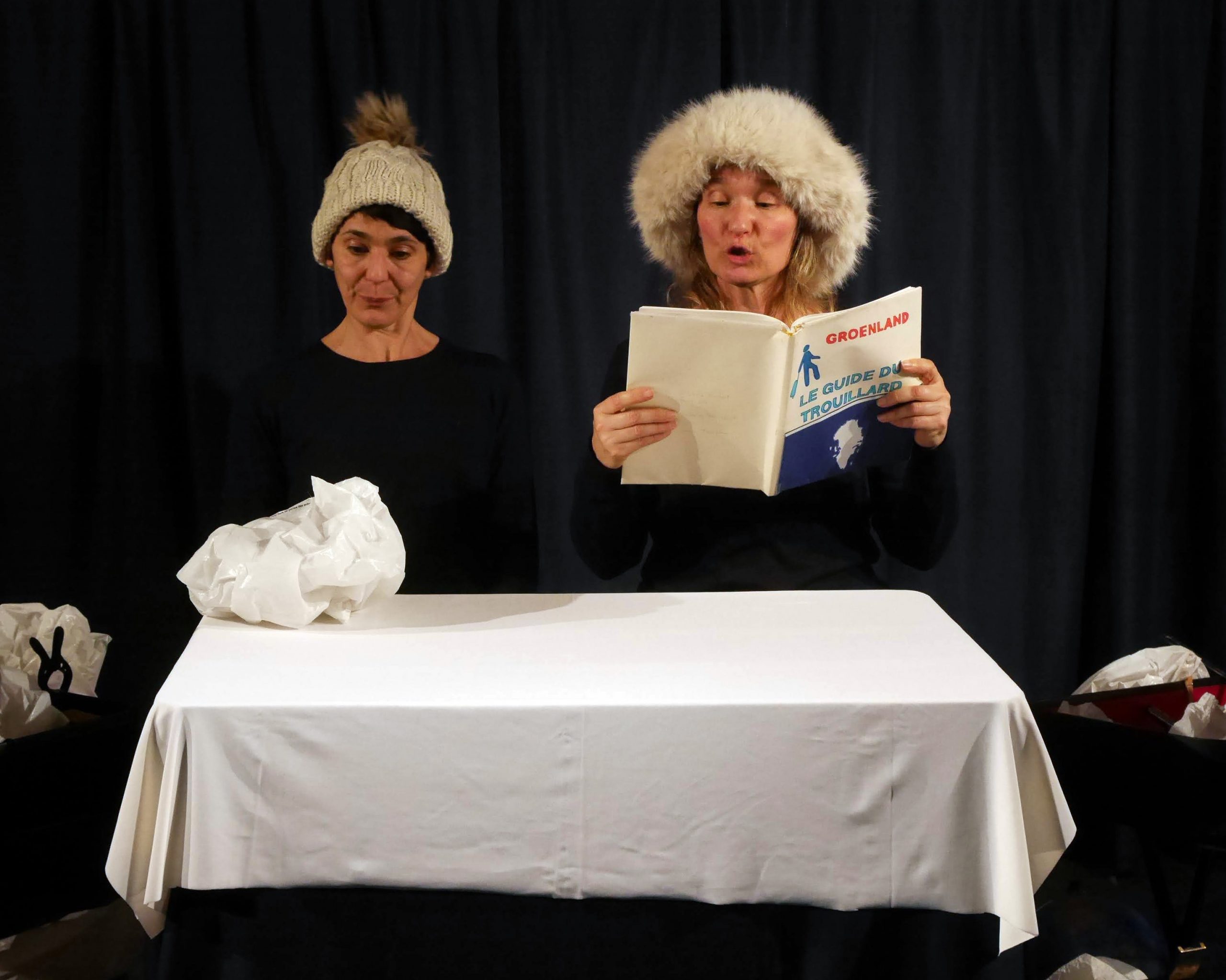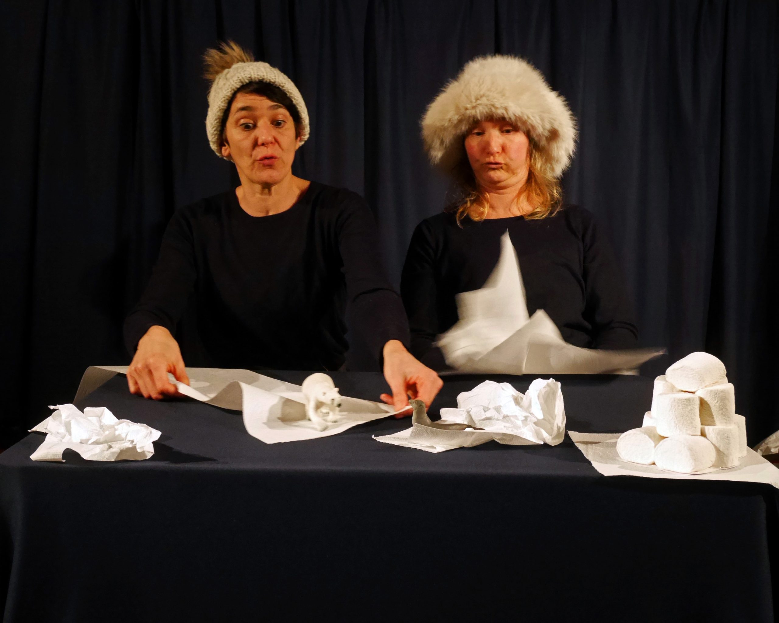 Un voyage poétique qui mêle théâtre d’objet et de matière. L’idée est d’embarquer les spectateurs dans l’immensité arctique. Un voyage drôle et inattendu à travers le regard de deux touristes un peu novices, et, pendant lequel toutes les références sont documentées et scientifiquement vraies (Oh un siku !). Nous plaçons les voyageuses dans les conditions extrêmes de l’univers épuré du Groenland. De tribulations en étonnements, leurs préjugés se confrontent à la réalité du terrain.