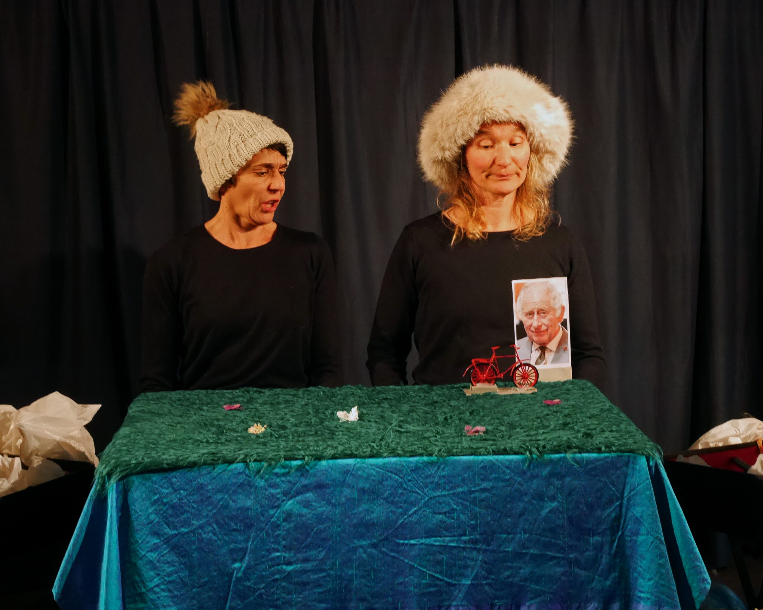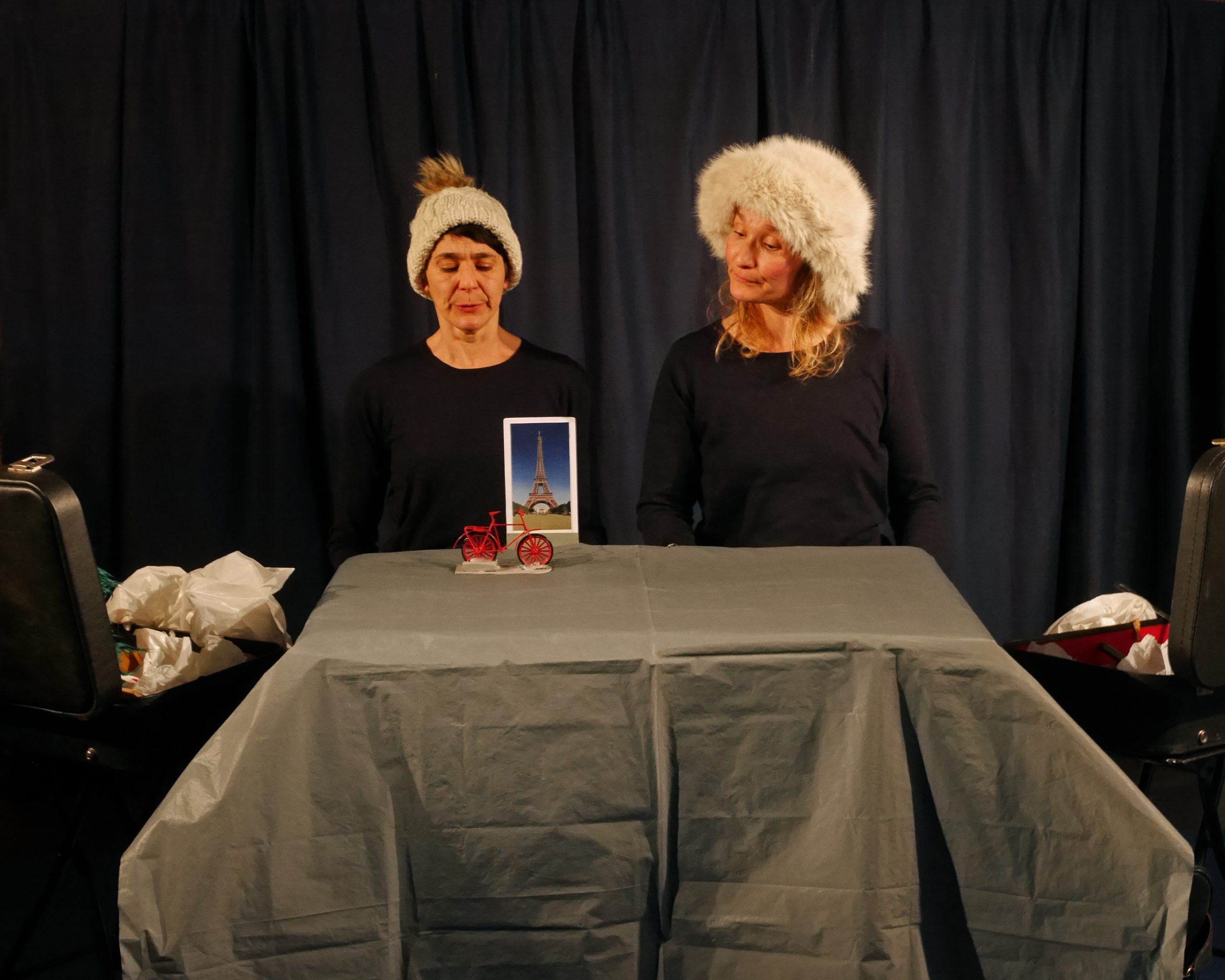 Sur ce terrain de jeux, le théâtre d’objet s’amuse avec ses décalages, métaphores et changements d’échelles. Dans un dispositif scénique très simple, composé d’une table et de deux valises, les comédiennes nous transportent dans l’aventure, nous dévoilent les paysages dans une succession de matières. Leurs objets symbolisent, les lieux, les situations, les personnages qu’elles manipulent avec humour et complicité.